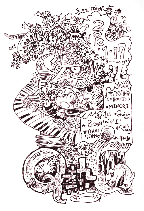 | 2010.5.12 フライヤ ------------------------- ちょっと前ですが、私のバンドのチラシなど…。 元々すきなことしかしていないバンド活動でしたが 続けているとどうしてもカタにはまってしまうもので、 だんだん「自分のバンドっぽさ」をなぞるようになってしまい…。 で、今年から心機一転、歌を歌ったり、歌を歌うための曲を一度やめて 演奏(インスト)に専念することにしました。 普通ここで「音楽性の違い」で解散するパターンなんですが まったくモメずに、やっております。 それって音楽性が合ってないってことじゃ…!? チラシも本業とはわけてデザインしてたんですが 今年からバンドと関係なく、好き勝手な絵を書いてます。 こちらも義務化するとまずいので 「下書きあまりしない、2時間以上かけない」をテーマに活動中! |