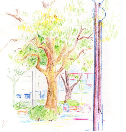 | 2010.5.24 水鉛筆 ------------------------- 水に溶ける色鉛筆、というおもちゃを入手して よく外に出るようになりました。 逆か。外に出るために購入。楽しいです。 公園にいると小学生に囲まれまて、あれこれ聞かれます。 「絵を描きながら世界を旅してるんですか?」 してません、近所です。 |