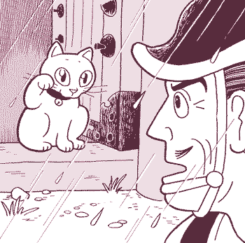 | 2010.8.24 まねき猫 ------------------------- 心霊現象特集の雑誌に載せていただいたカットです。 徳川譜代中の譜代、井伊家は家康の信頼厚く それゆえに西国からの反乱防衛の要、彦根をまかされたんですが 一方で滅亡した武田軍の残党を多く雇いいれたことから その赤いヨロイも受け継ぎ、「井伊の赤備え」として 戦場でも敵を震え上がらせていたそうです。 その藩主が江戸での鷹狩り中、突然の雨にみまわれ お供たちともはぐれて一人、大きな木の下で雨宿りしておりました。 すると、そばのさびれた寺の門で 白猫が手招きをしているではりませんか。 不思議に思って近づいたその途端! 轟音とともに後ろの木に雷が落ち、藩主は無事一命をとりとめたのでした…。 以上、ひこにゃんの由来でした! |