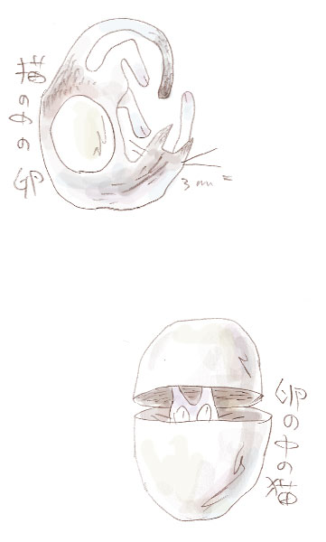 | 2010.9.5 たまごねこ ------------------------- はからずも猫が続きますね。 先日再放送していたテレビで 「ホニュウ類繁栄の決め手は卵生から胎生への転換!」 というのが衝撃でした。 胎盤ってすげー器官なんですわ。 |